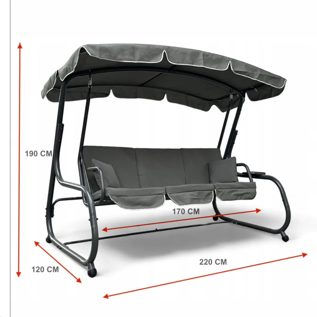 Przestronna, wolnostojąca huśtawka ogrodowa 3-osobowa sprawdzi się idealnie na tarasie, w ogrodzie lub na działce. Solidna stalowa konstrukcja z malowaniem proszkowym gwarantuje wytrzymałość oraz odporność na warunki atmosferyczne. Została zaprojektowana z myślą o komforcie — wygodne siedzisko (długość ok. 170 cm) pozwala swobodnie usiąść lub się zdrzemnąć, a regulowany daszek chroni przed słońcem i lekkim deszczem.