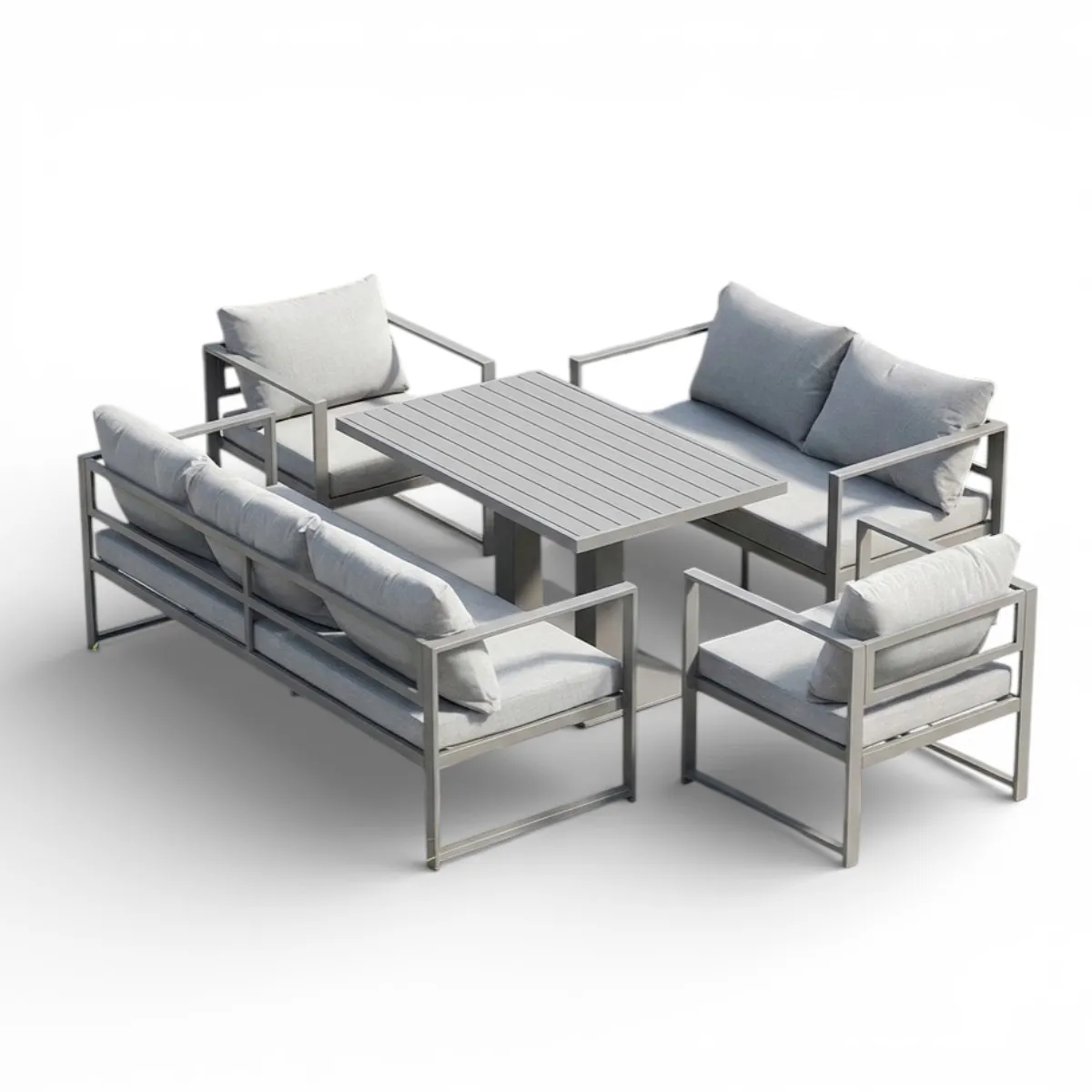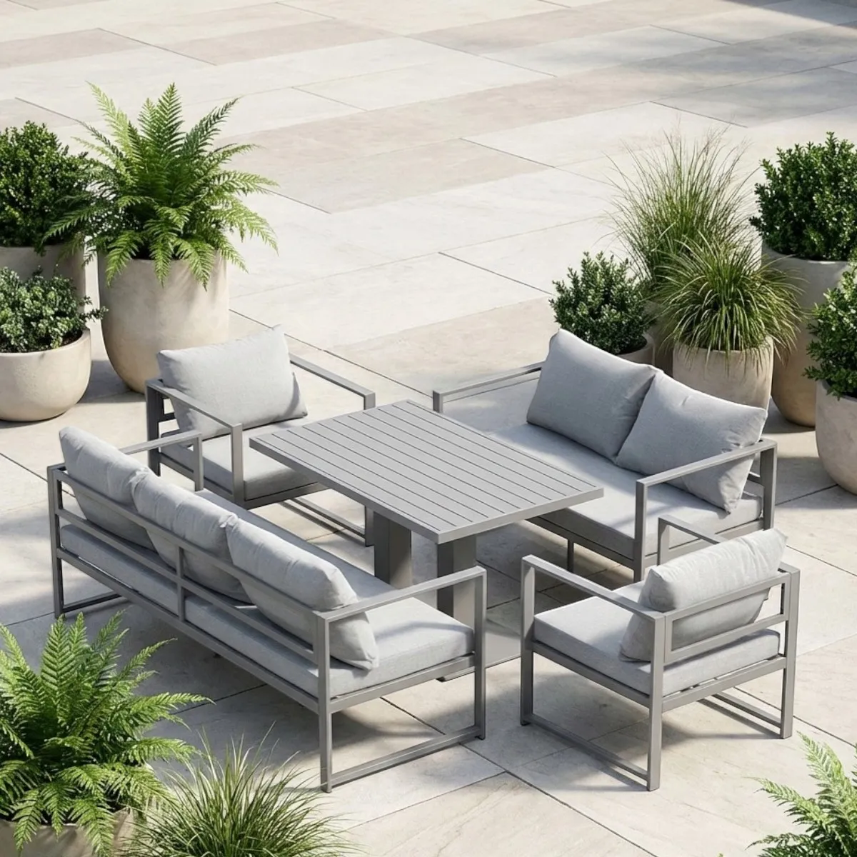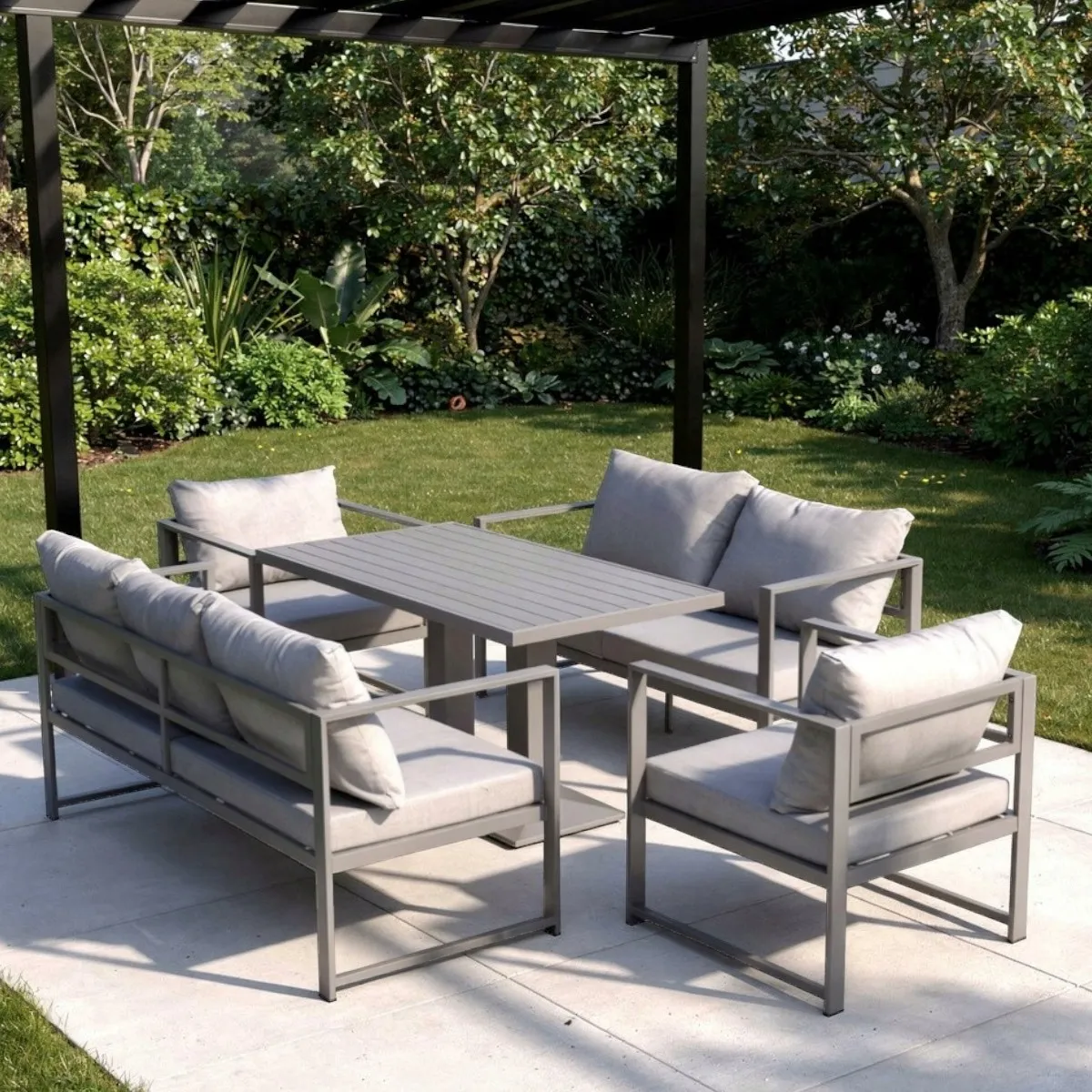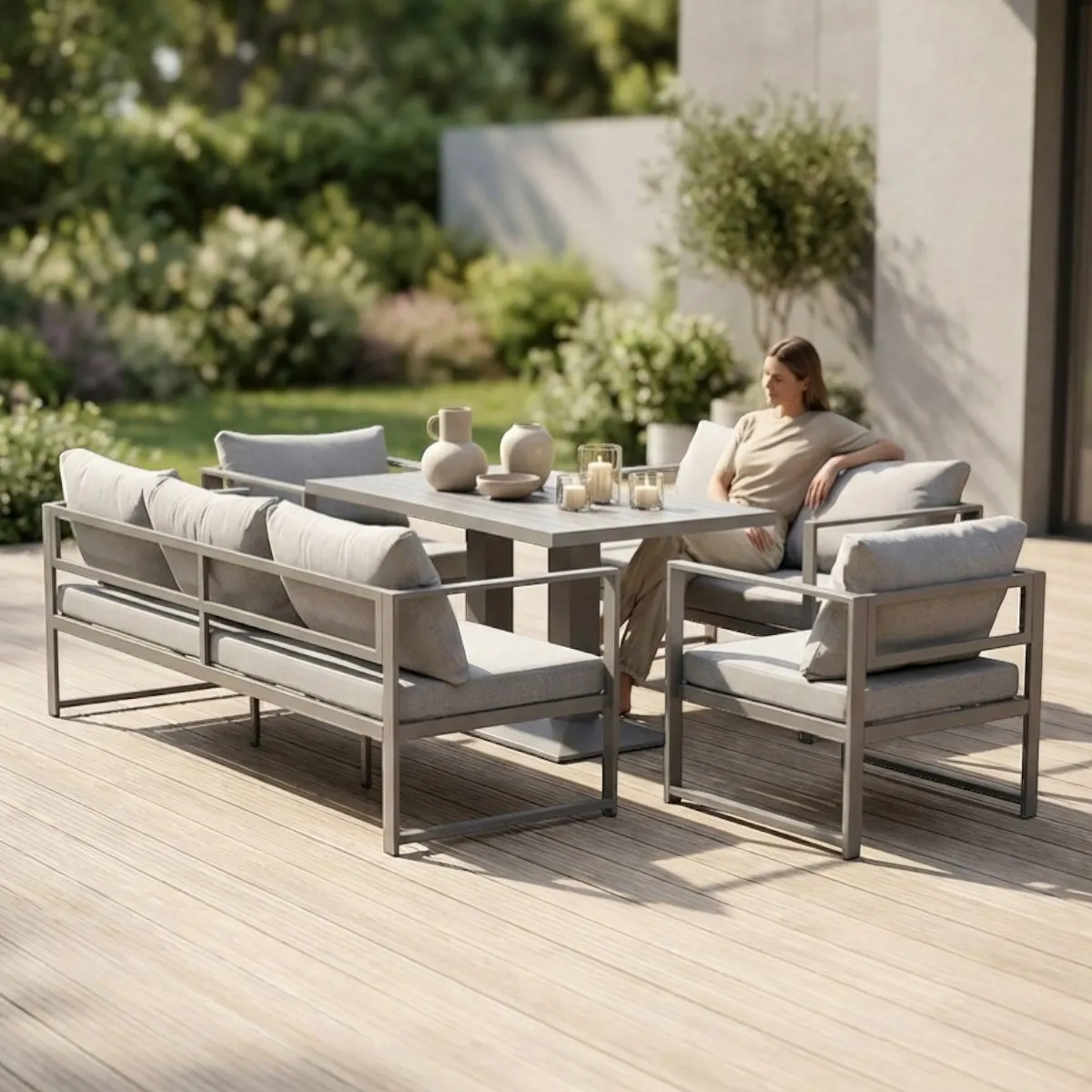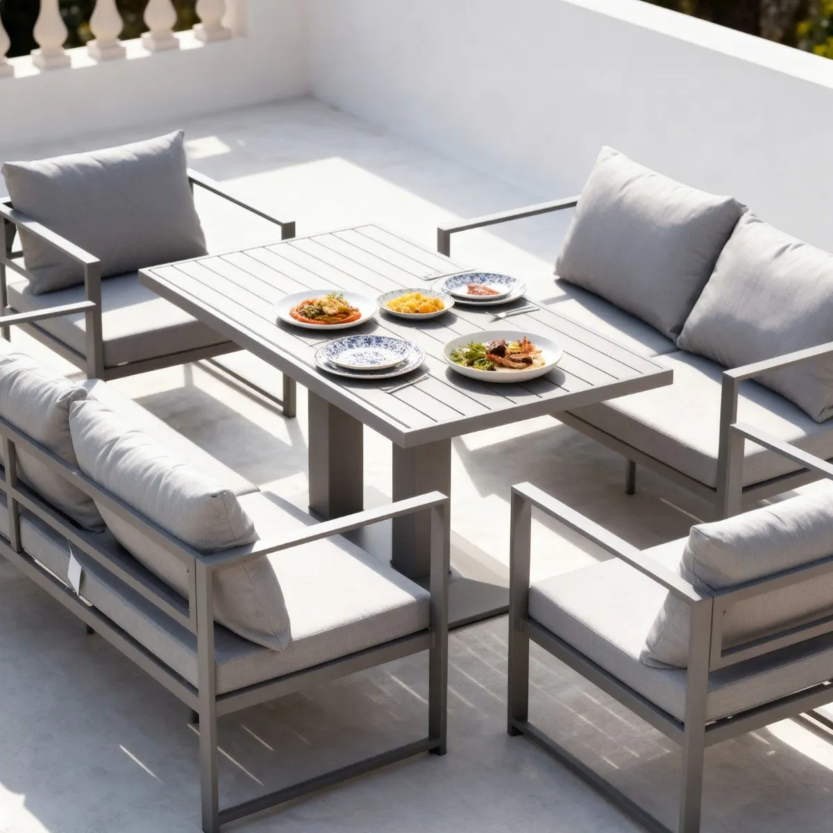 Odkryj zestaw San Sebastian – idealny wybór dla tych, którzy szukają nowoczesnych, trwałych i wygodnych mebli ogrodowych. Dwie wygodne sofy, dwa fotele oraz stół tworzą przestrzeń idealną do wypoczynku, spotkań z rodziną i przyjaciółmi.
