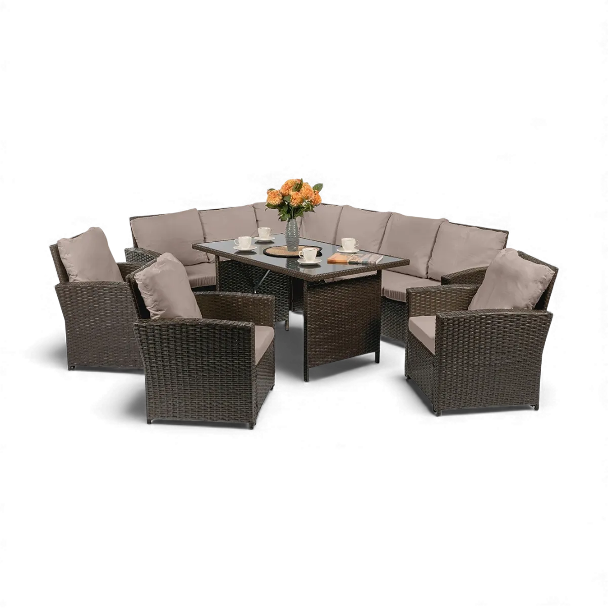 • Zestaw obejmuje: narożnik, stół oraz trzy fotele – idealny komplet dla 9 osób